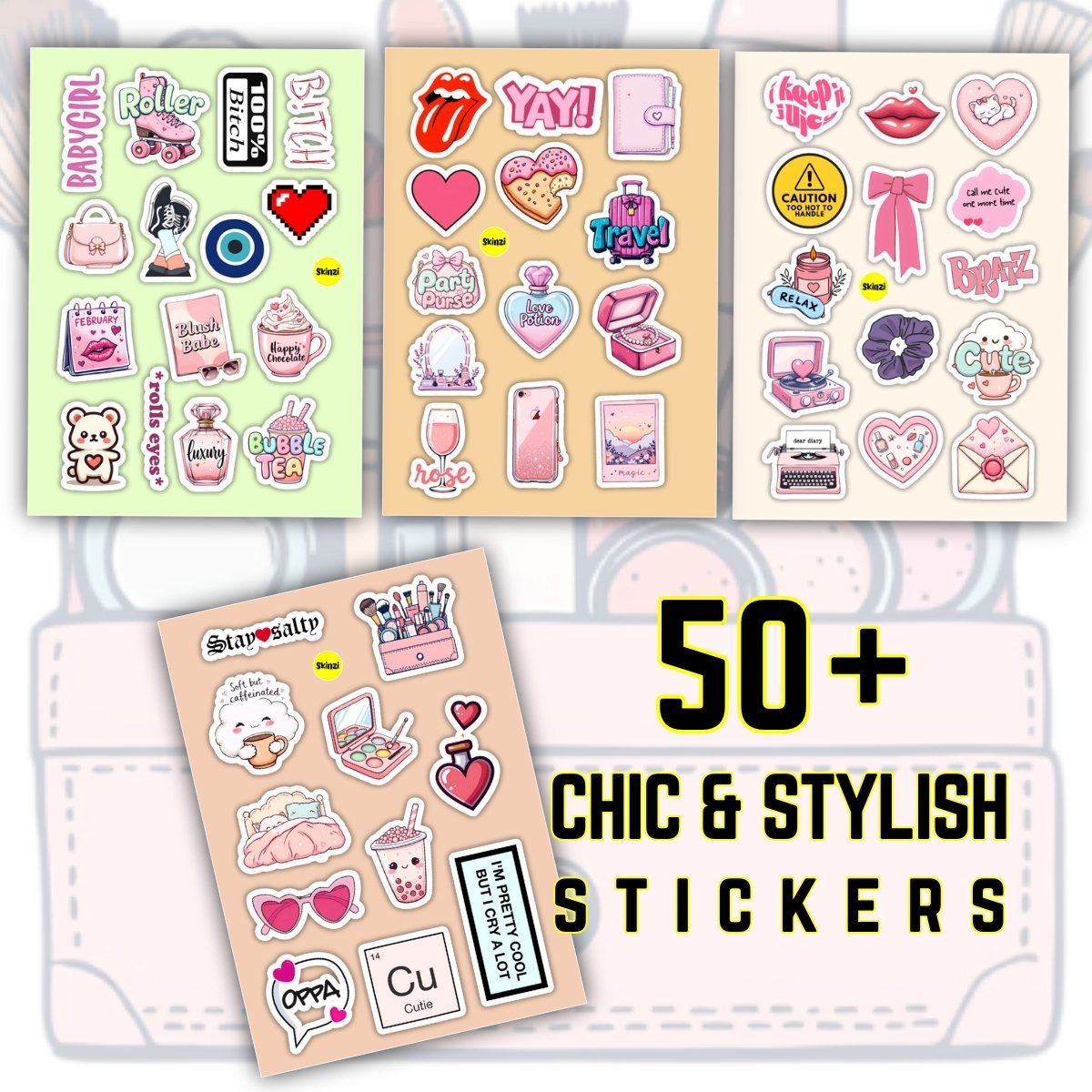 Unleash your inner fashionista with Skinzi’s Chic & Stylish Sticker Pack, a curated set of over 50 premium vinyl stickers designed for those who love elegant, trendy aesthetics. Each sticker is printed on high-quality, waterproof vinyl with vibrant colors that won’t fade. These peel-and-stick designs are perfect for customizing laptops, water bottles, phone cases, journals, luggage, and more — turning everyday items into stylish accessories.