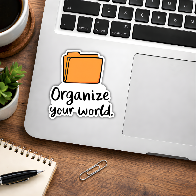 Add a touch of bold personality with our “Organize Your World” die-cut sticker. Designed for those who aren’t afraid to stand out, this high-contrast caution decal is as durable as it is eye-catching. Whether it’s your morning coffee tumbler or your trusty laptop, this sticker sends a clear message in style.
