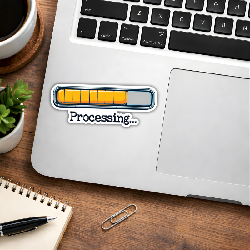 Add a touch of bold personality with our “Processing” die-cut sticker. Designed for those who aren’t afraid to stand out, this high-contrast caution decal is as durable as it is eye-catching. Whether it’s your morning coffee tumbler or your trusty laptop, this sticker sends a clear message in style.